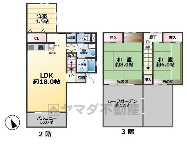 | 間取り詳細 | LDK18畳(2F)、洋4.5畳(2F)、和8畳(3F)、和6畳(3F) | 土地権利 | 所有権 |